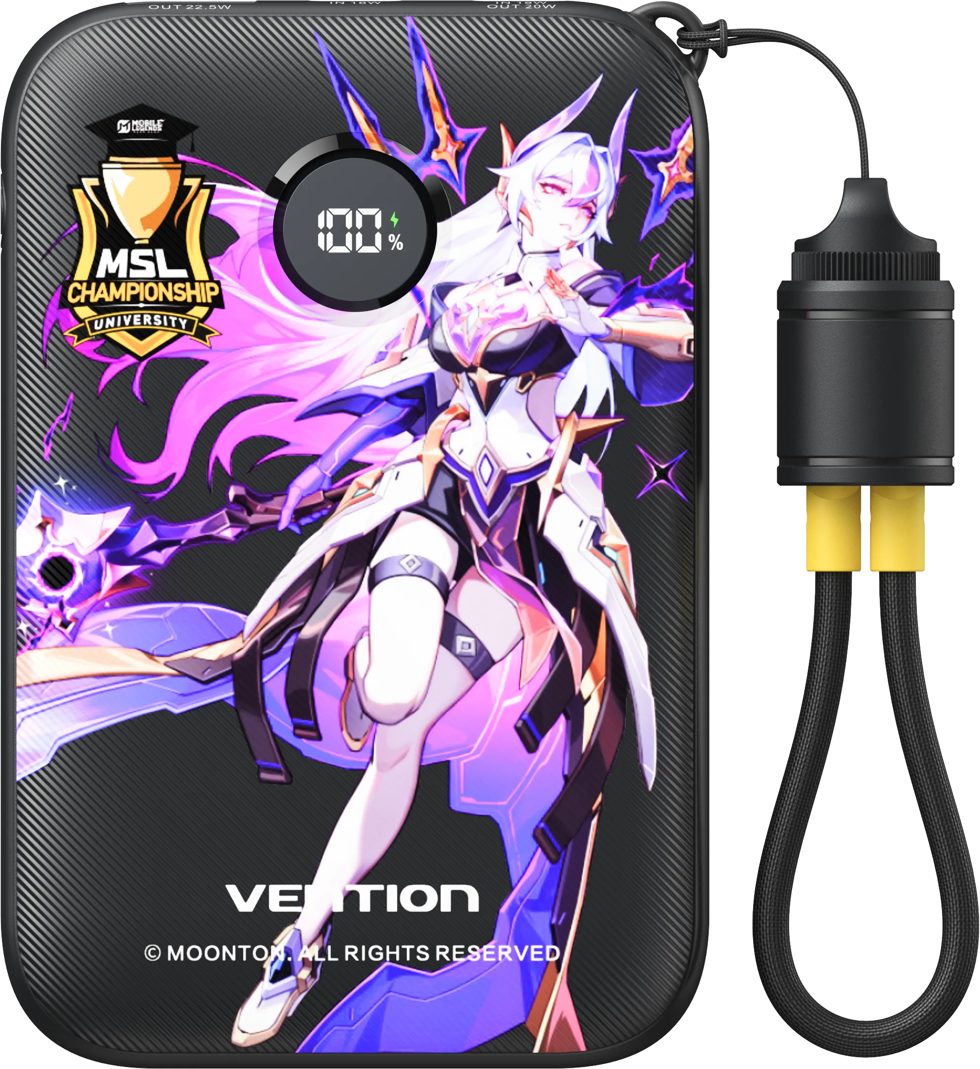 Level up your everyday charging with this Vention 22.5W power bank, where performance meets standout design. With fast-charging capability, it keeps your devices powered efficiently whether you are gaming, travelling, or on the move. The built-in 2-in-1 Type-C cable adds everyday convenience, while its CCC certification ensures reliable and safe use. Wrapped in bold, collectible artwork inspired by the MSL Championship, this power bank is as stylish as it is functional. Each set includes a free character standee, making it a must-have for tech and gaming fans alike. A limited-edition essential worth securing while stocks last.