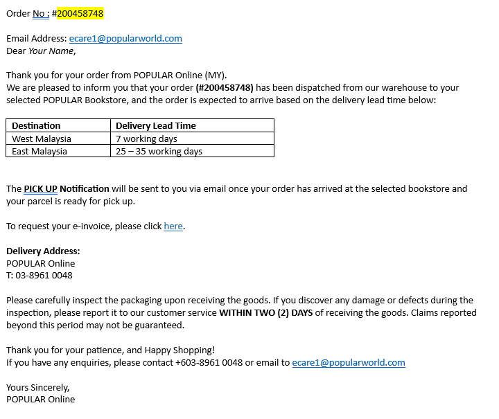 https://www.popularonline.com.my at “My Order” page) in the E-Invoice Request Form.